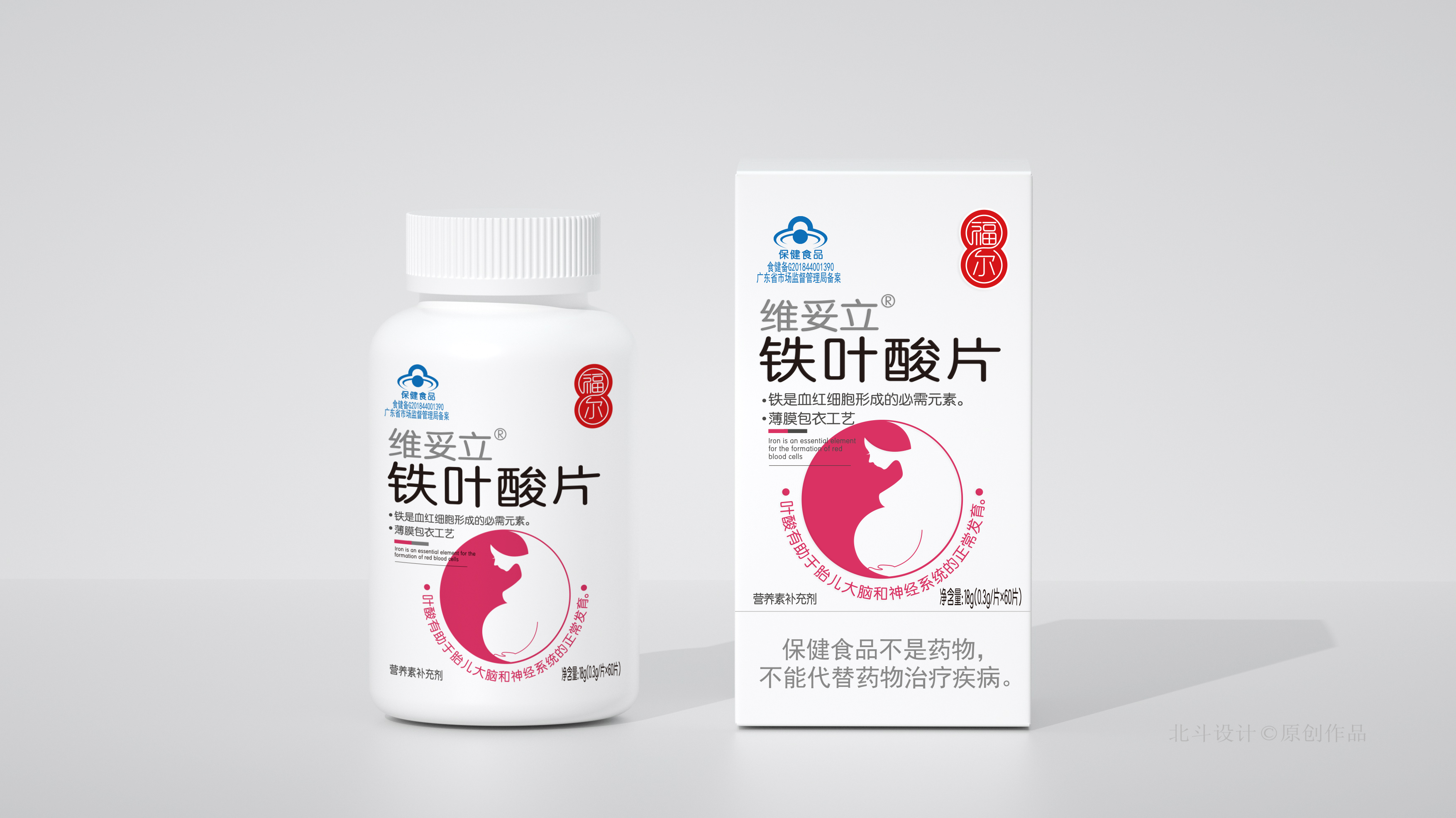 福爾為大參林直營(yíng)保健品品牌,其下的鐵葉酸片保健食品包裝設(shè)計(jì)為北斗設(shè)計(jì)創(chuàng)意。