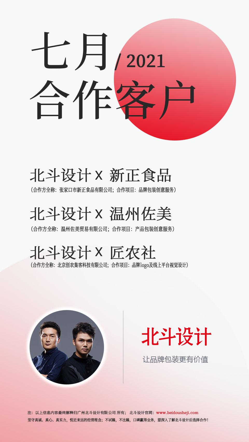 悅近來(lái)遠(yuǎn),北斗設(shè)計(jì)2021.7月新簽約的客戶的都是以往客戶,及轉(zhuǎn)介紹客戶,感謝您們對(duì)于北斗設(shè)計(jì)信任與支持。我們將為您們帶來(lái)“美學(xué)+認(rèn)知”一體的創(chuàng)意服務(wù),為您提供更有記憶點(diǎn),價(jià)值感和差異化的品牌包裝設(shè)計(jì)。